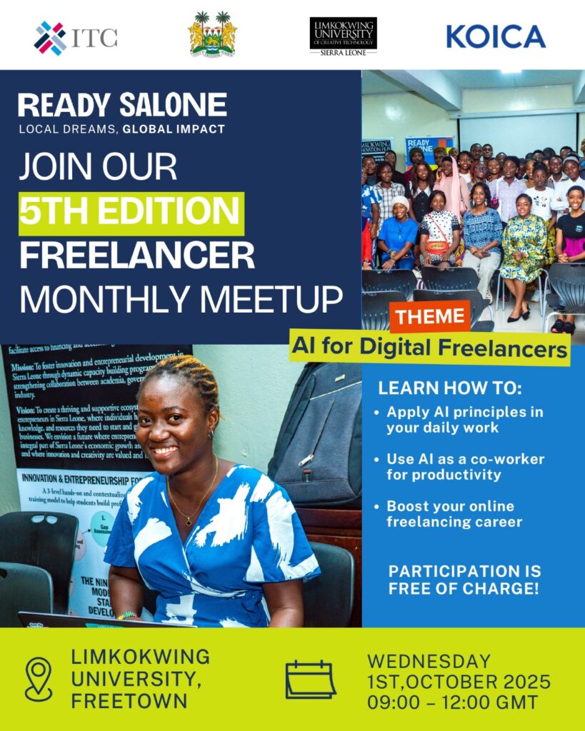 Join us for the 5th READY Salone Monthly Freelancer Meetups, our networking session designed to connect aspiring and practicing freelancers under the ITC Realizing Empowerment and Acceleration in Digital for Youth (READY Salone) project on Wednesday 1 October at 09:00 – 12:00 GMT at Limkokwing University in Freetown. Participation is free of charge!
